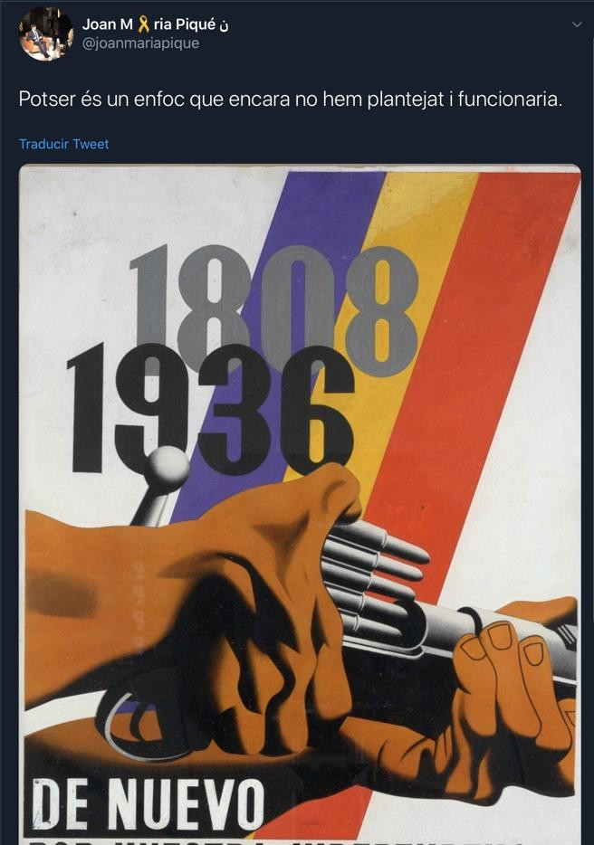 Concretamente, publicó un cartel del bando republicano durante la Guerra Civil que hacía referencia al levantamiento popular contra las tropas napoleónicas de 1808 y que era utilizado para responder al golpe de estado del general Franco de 1936. Así, en la ilustración aparecen unas manos con un fusil y una frase sobre el fondo de la bandera republicana: “de nuevo por nuestra independencia”. La aportación personal de Piqué -con polémica y borrado- fue hacer público su comentario: “Quizás es un enfoque que aún no hemos pensado y funcionaría”. Piqué suprimió el tweet argumentando que no se había dado cuenta de que aparecía un arma en el cartel.