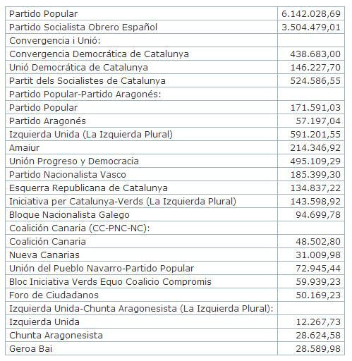 Dado que el importe de la ayuda que se entrega a cada partido es proporcional a su número de diputados en el Congreso, el Partido Popular fue el máximo beneficiario, ya que recibió 6,1 millones de forma directa y otros 171.591 euros a través del PP de Aragón.