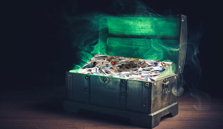 Recreación de la Caja de Pandora de la mitología, con los papeles (AI).