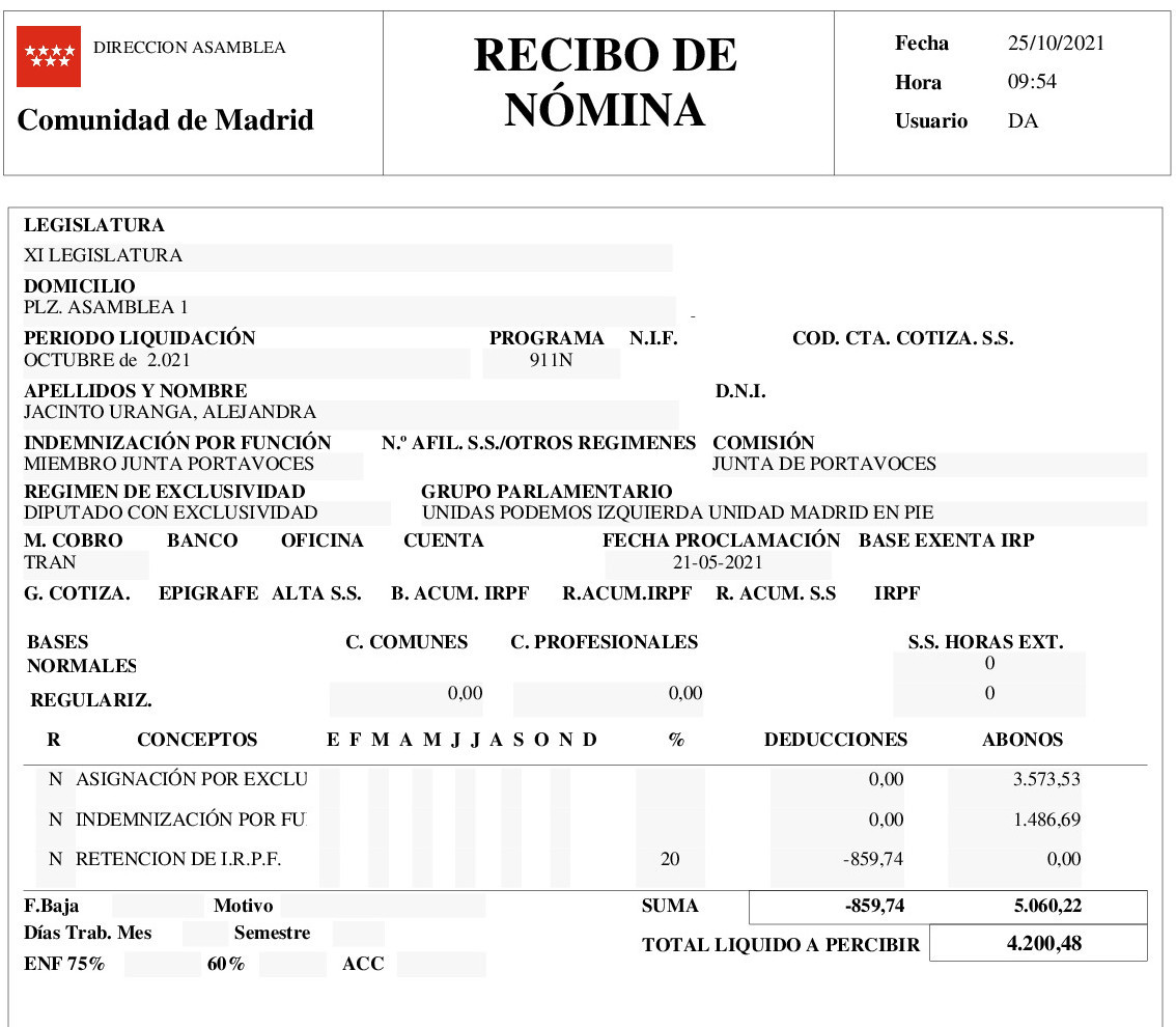 La nómina publicada en la página web de la Asamblea de Madrid corresponde a la mensualidad de octubre, con dedicación exclusiva. Cobró 3.573 euros de asignación por exclusividad y 1.486 euros de indemnización por función. Son 14 pagas anuales. Jacinto es portavoz adjunta de su grupo, portavoz de una comisión y portavoz adjunta de otra. La retención de IRPF alcanza el 20%, 859 euros. Por lo tanto, el mes pasado cobró 5.060 euros brutos y la cantidad neta fue de 4.200 euros. En diciembre, con la paga extraordinaria de Navidad, sus ingresos se duplican: Más de 10.100 euros brutos, unos 8.400 netos.
