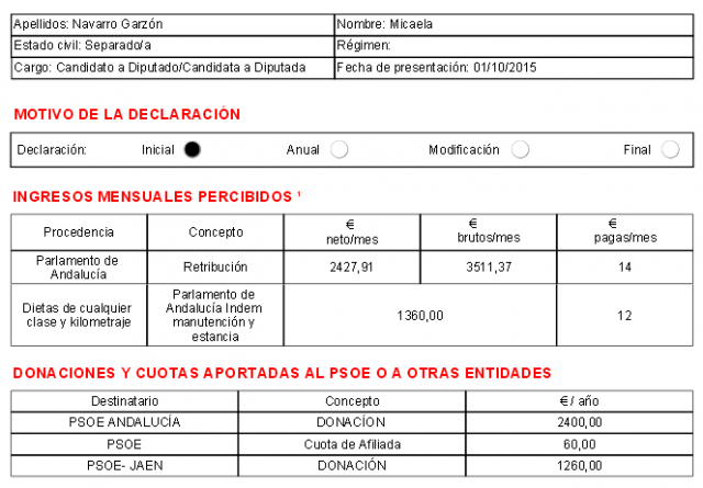 Además, según la declaración de bienes y rentas que publica en la página del PSOE, cosa que agradecemos, Navarro reconoce haber percibo rentas en especie del Parlamento de Andalucía (seguro de vida y Seguridad Social) por valor de 3.894 euros netos.