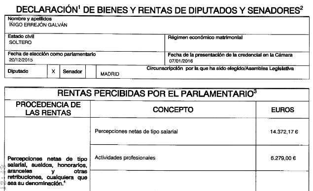Íñigo Errejón, número dos de Podemos y portavoz de su grupo parlamentario, ha declarado unas rentas netas de 20.651 euros el pasado ejercicio, de los que 14.372 euros proceden de “percepciones netas de tipo salarial”, mientras que los otros 6.279 euros tienen como origen actividades profesionales. También tuvo 81 euros procedentes de los rendimientos de sus cuentas bancarias. Parece que Errejón sí ha rellenado correctamente el formulario. Ayer comentábamos que el diputado de Ciudadanos, Albert Rivera, había puesto cantidades brutas.