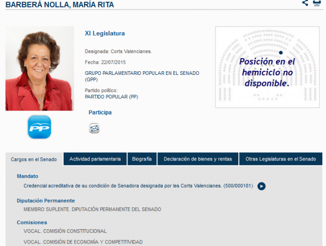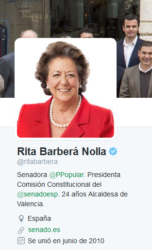 En su cuenta de Twitter sigue afirmando que es presidenta de la Comisión Constitucional. Tendrá que actualizarlo porque la web del Senado dice que María Rita Barberá Nolla es 'vocal' de dos comisiones y miembro suplente de la Diputación Permanente.