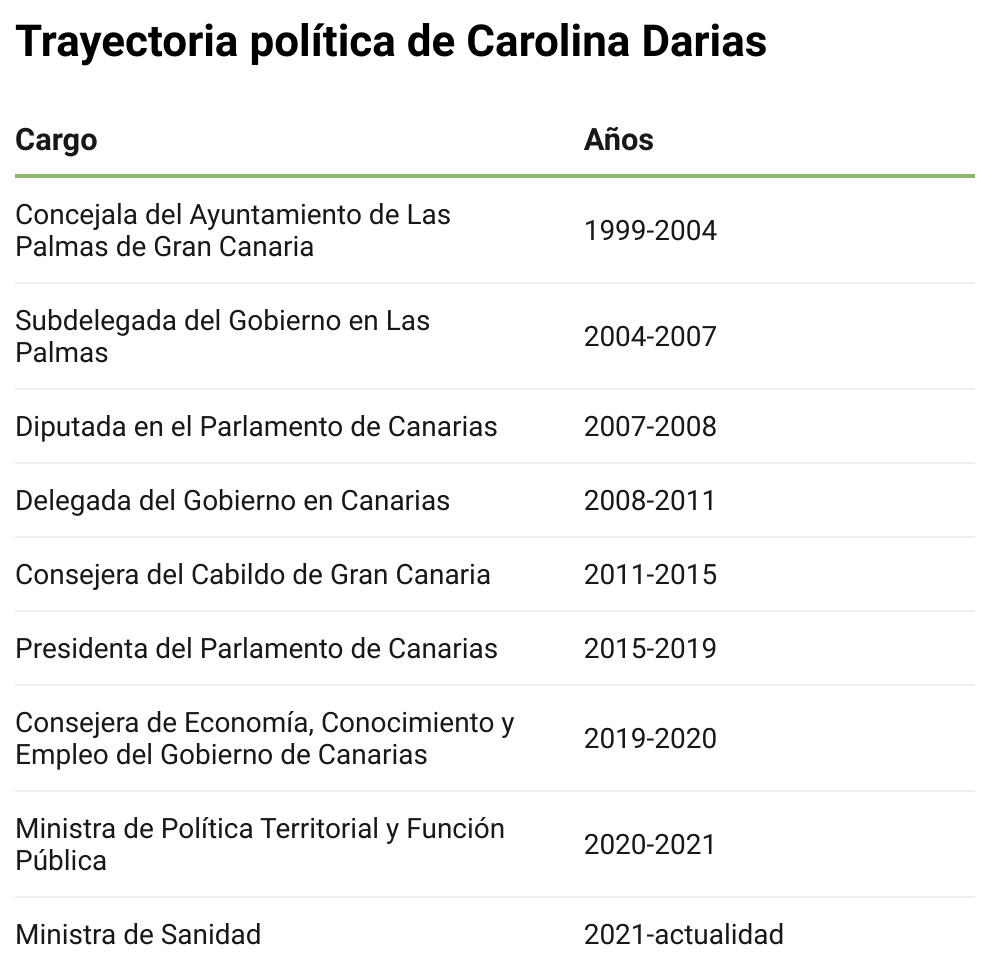 De 2015 a 2019, ejerció como presidenta del Parlamento de Canarias, cargo que finalizó cuando le nombraron consejera de Economía, Conocimiento y Empleo en junio de 2019. En enero de 2020 anunciaron su nombramiento como ministra de Política Territorial y Función Pública. Un año después cesó y le sustituyó Miquel Iceta. Darias ocupó el ‘sillón’ en el Ministerio de Sanidad. Sigue los pasos que el anterior responsable de la cartera, el ministro más famoso durante la pandemia de la Covid-19. Salvador Illa dejó Madrid para presentarse a la lista del PSC en las elecciones catalanas.