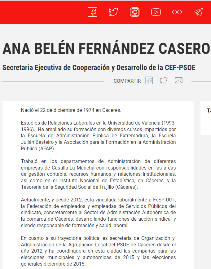 Algo parecido hemos detectado en la información publicada en la página web del PSOE, luego modificada, con el currículum de la diputada Ana Belén Fernández Casero. Asumió el cargo de portavoz adjunta de la Junta de Portavoces de su grupo en enero de 2020. Lleva cobrando sueldos públicos en política desde 2015.