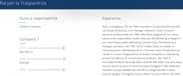 Se llama Antonio Campo Dall’Orto y desde el 6 de agosto de 2015 es el director general de la RAI, la Radiotelevisión pública italiana. Hace cuatro días, la página web del ente habilitó una sección de ‘Transparenza’. (Pincha en Corporate, en la parte superior derecha y se abre un desplegable. Al final está la sección. Busca ‘compensi’). Ayer nos daba error pero este viernes hemos podido consultar los datos.