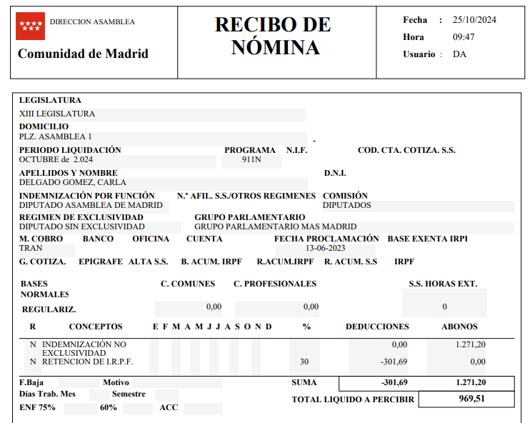 Nómina de octubre de 2024 de la Asamblea de Madrid.