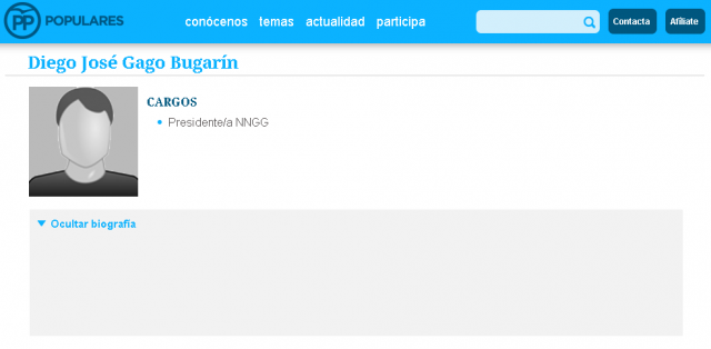 En el momento de redactar este artículo, viernes 5 de mayo, la página web del PP seguía sin completar los datos biográficos de Gago y sin publicar su foto como puedes comprobar en esta captura de pantalla.