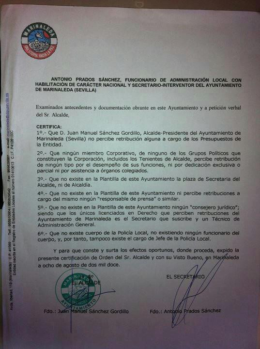 Documento hecho público por el Ayuntamiento de Marinaleda que acredita que Gordillo no percibe retribución alguna del consistorio, no hay cuerpo de Policía, ni jefe de Policía, ni jefe de Prensa.