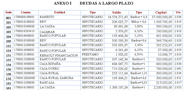 Hay otro de la CAM que vence este año cuyo importe superaba los tres millones de euros. Faltan por pagar casi 163.000 euros. También es destacable la información sobre el tipo de interés aplicable a cada crédito. Cada apunte, cada crédito tiene unas condiciones singulares, algunos referenciados al euríbor, pero otros con una tasa de casi el 7%, como es el caso de un préstamo de Renault Financiación, que vence este año, por valor de 10.000 euros. Una auténtica sangría para las cuentas del partido. En suma, el saldo pendiente con fecha de 2016 es de 23,68 millones de euros y otros 460.000 euros de ‘leasing’. En total, más de 24 millones de euros en deudas a largo plazo.